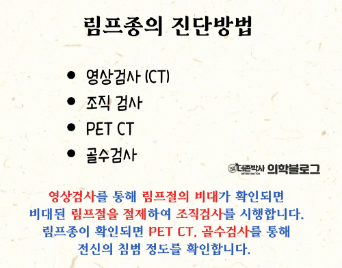 림프종의 진단은 영상 검사 후 조직 검사를 통해 이루어집니다. 림프절 비대의 정도와 범위를 확인하기 위해 CT와 같은 영상 검사를 시행하고, 조직 검사를 통해 림프종을 확정합니다. 정확한 분류를 위해 조직생검이 중요하며, 패시티나 골수 검사를 통해 전신의 침범 부위를 확인합니다.
