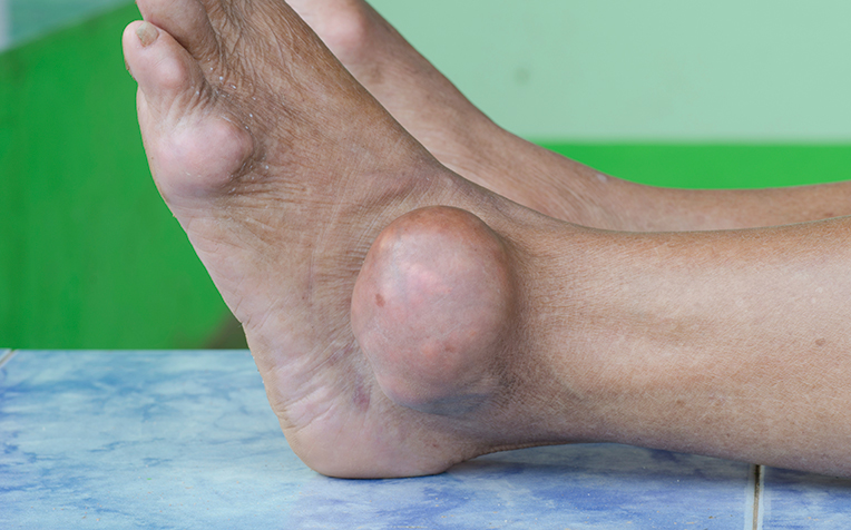 통풍이 발생한 후에도 아무런 치료를 받지 않으면, 만성 결절성 통풍으로 진행되어 신체의 여러 곳에 요산 덩어리가 다양한 크기의 결절(토푸스)들로 나타나며, 극심한 통증을 유발할 수 있습니다.